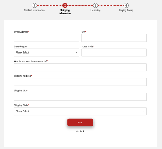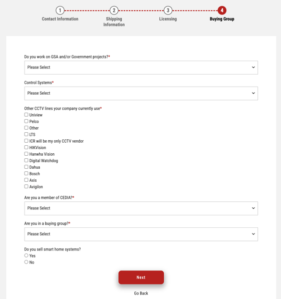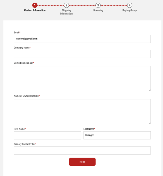 - There are three pages of questions including, Contact information, Shipping Information, Licensing, and Buying Group Information