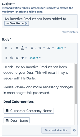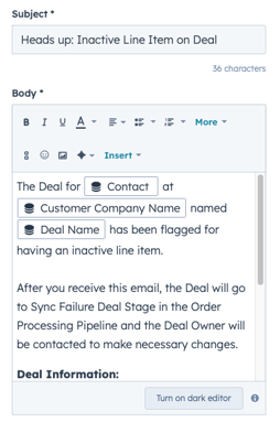 - An Internal email will be sent to the Deal Owner notifying them of the Inactive Line Item and to Please make Necessary Changes